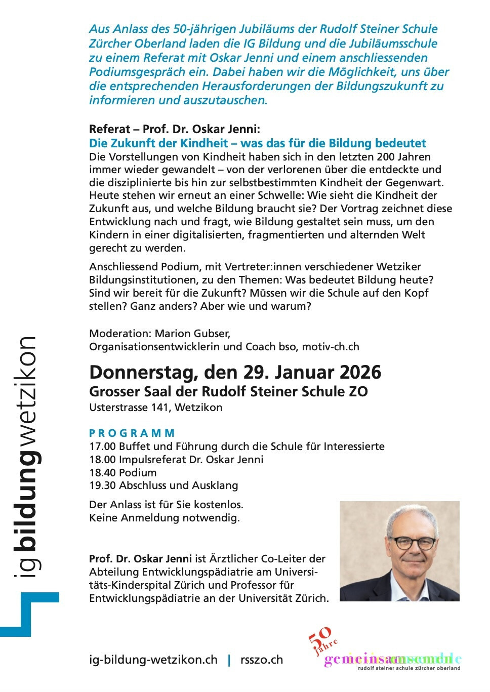 Aus Anlass ihres runden Geburtstages findet am Donnerstag, 29. Januar von 17:00 bis 19:30 Uhr ein Referat von Oskar Jenni mit anschliessendem Podiumsgespräch statt, an welchem VertreterInnen verschiedener Bildungsinstitutionen in Wetzikon, darunter der Kantonsschule und der Schule Nepomuk teilnehmen. Folgende Fragen stehen dabei im Zentrum: Was bedeutet Bildung heute? Sind wir bereit für die Zukunft? Müssen wir die Schule auf den Kopf stellen?